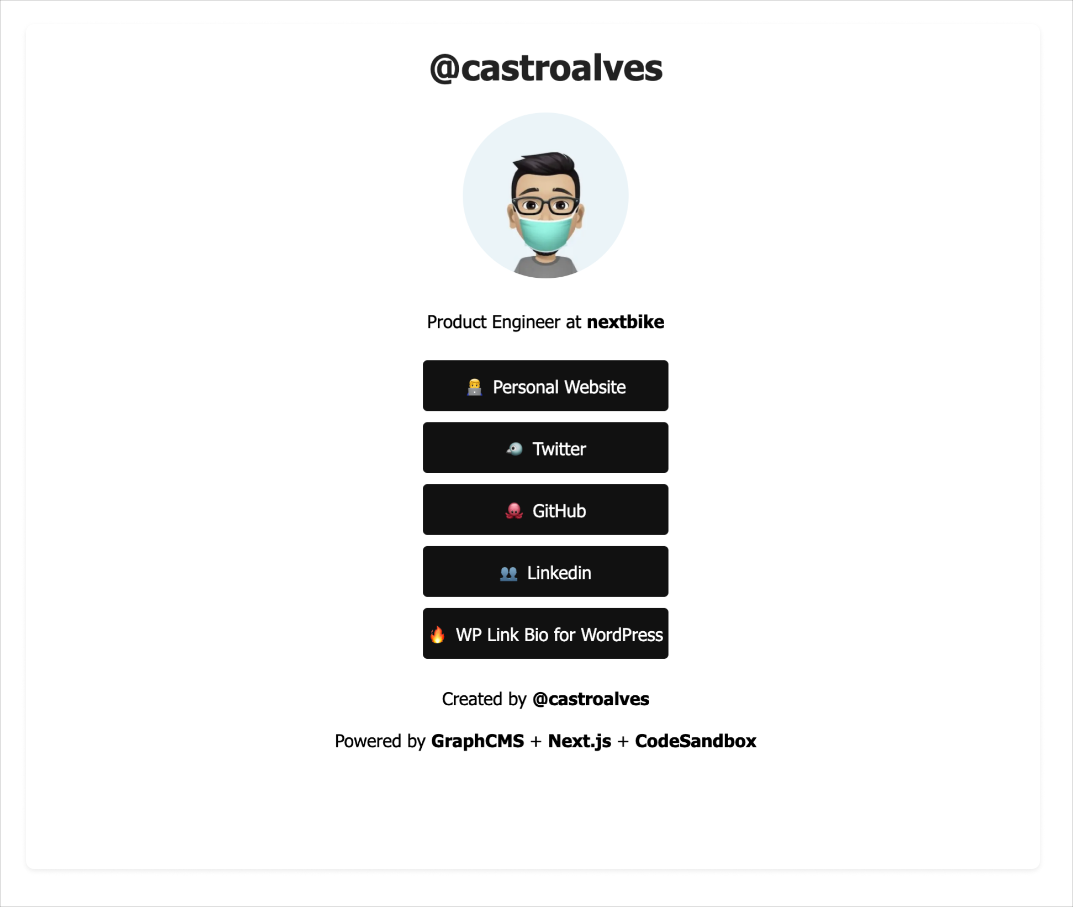 Cadu de Castro Alves built a linktree clone for himself using Next.js, Hygraph, and Codesandbox. A seemingly simple idea, but brilliant execution and great way for people to find him and his work. We also can't help but love his dedication to staying safe with his avatar mask.